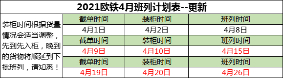 關(guān)于歐鐵荷郵小包渠道4月班列裝柜安排的通知--更新